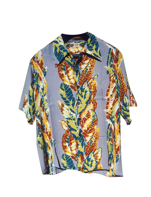 Loud mid 40’s rayon vertical print with broad croton leaf design. Manufactured By XXXX.